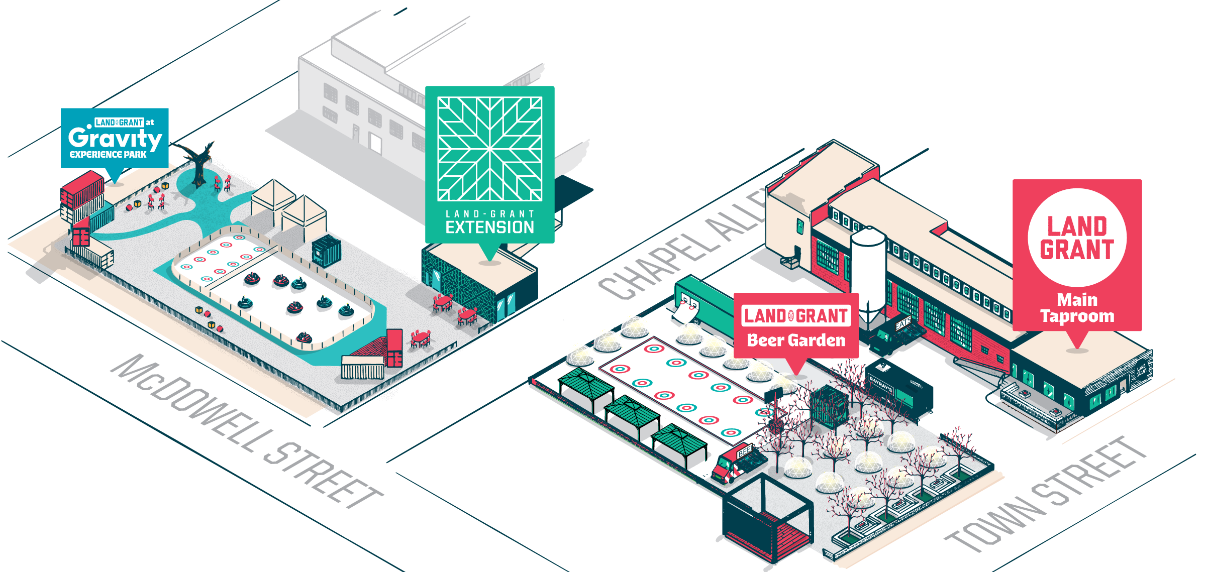 If your reservation is for Gravity Park, head past the main Land-Grant Taproom, go towards the alley, turn left. Go past Land-Grant Extension and you’ll see the gated entrance to Gravity Park. Once inside, head to the blue shipping container to check-in.